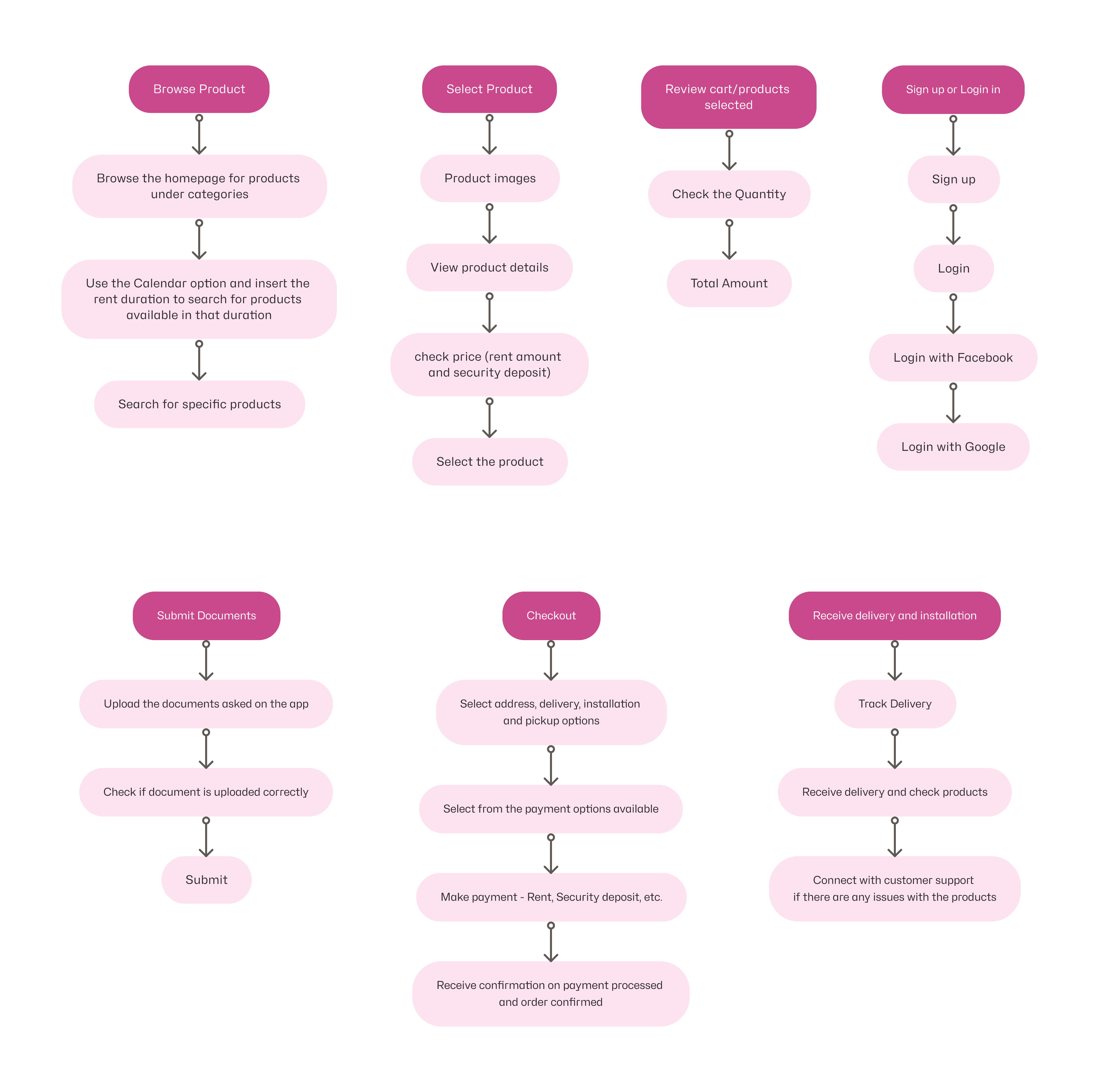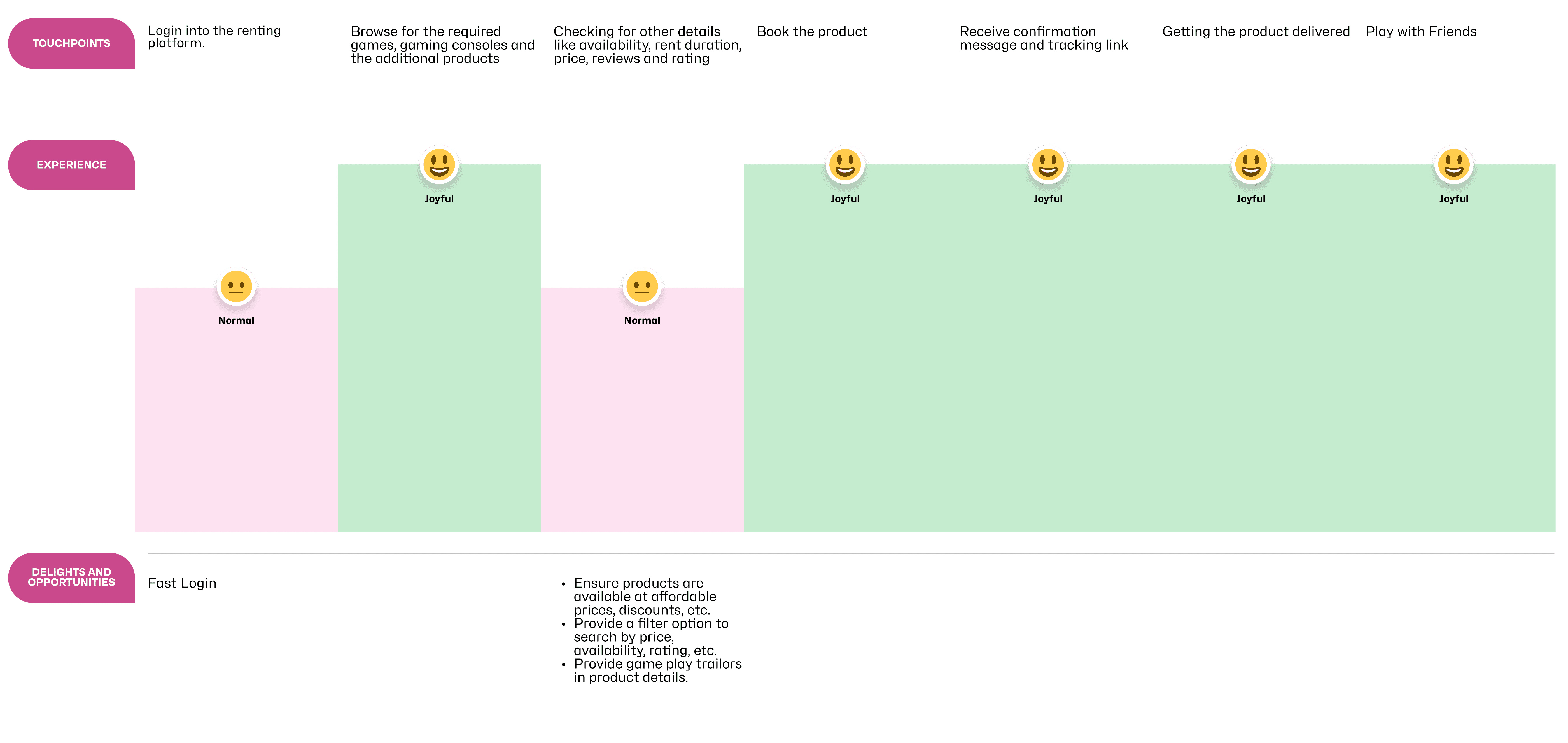 I’ve created this journey map based on the research I did before I started designing. Here this map shows the overall journey that the user will encounter while renting from our app, and this is also showing his possible reactions.