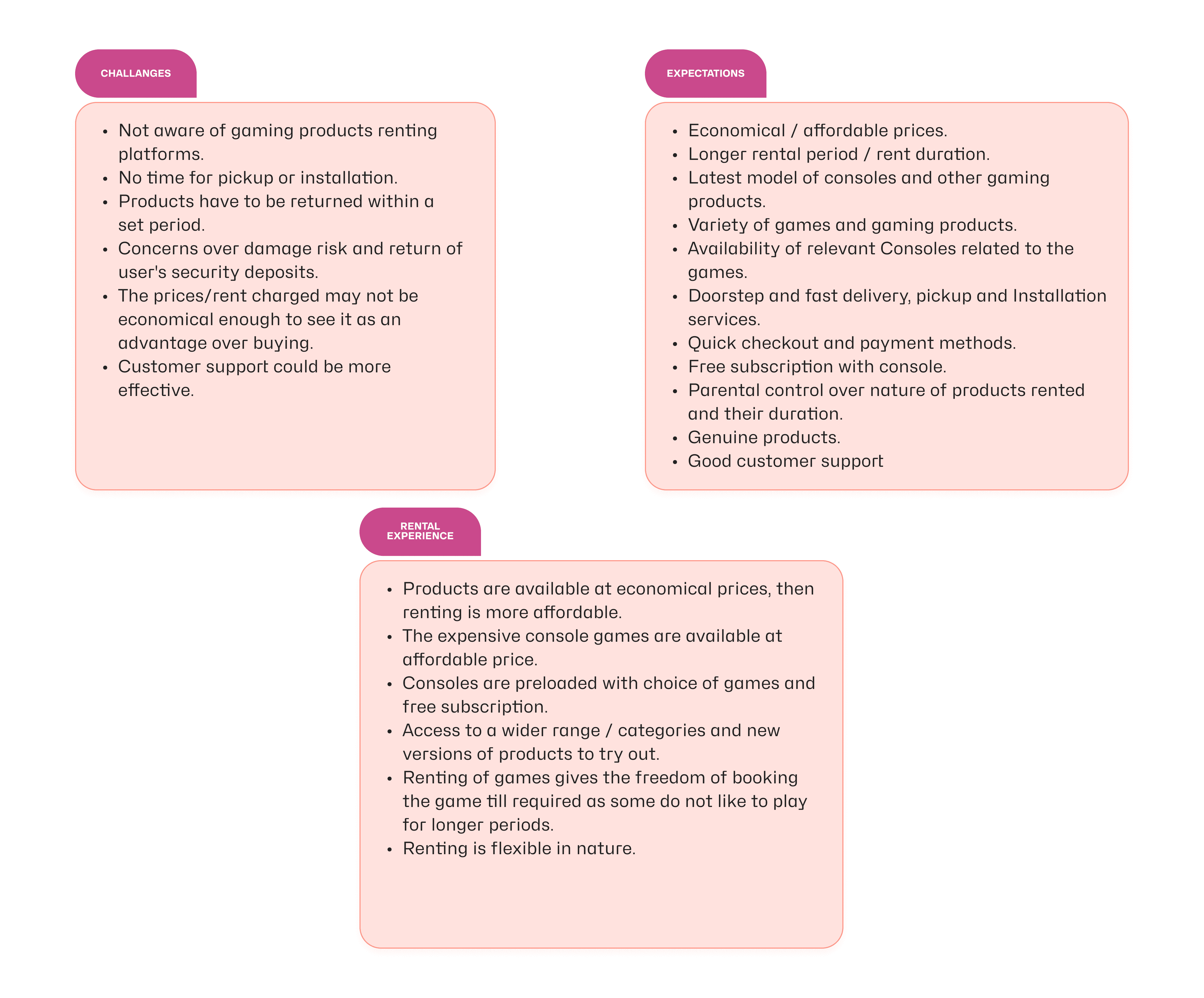 This survey gave me a clear understanding of my user's main frustrations and goals. I determined the percentage of users interested in a game rental app and their expectations from the survey. This survey showed us that a major amount of our survey respondent were not aware about the gaming rental application. This survey allowed users to select their preferences from the given options and provide their answers in their own words also. After that, I deduced the tasks that the users wanted to perform.