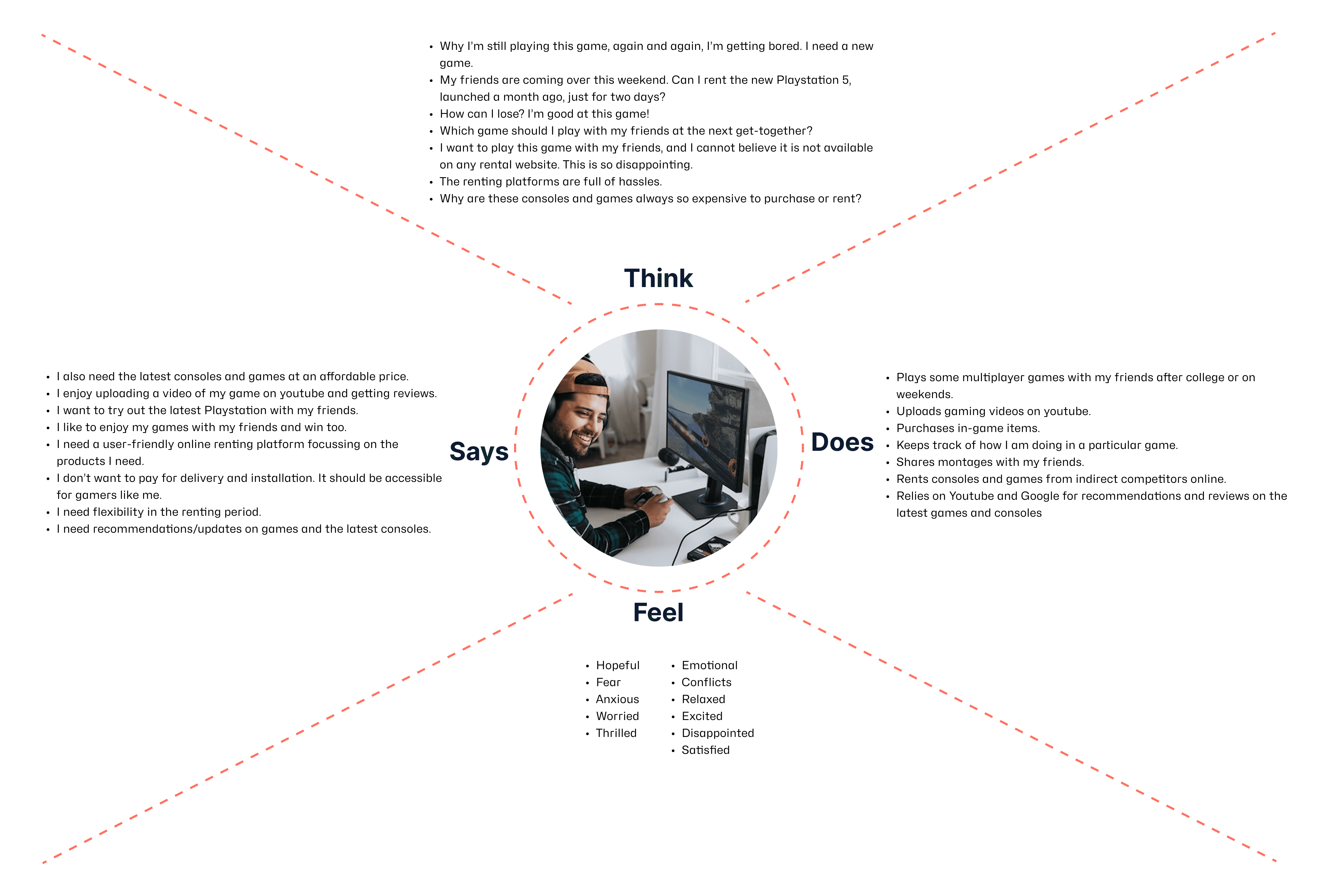 The empathy map assists us in empathizing and synthesizing our research findings and helps us in finding users’ requirements. I’ve created one empathy map by which I found users’ behaviours and decisions. Here user plays multiplayer games and thinks about owning a new gaming console.