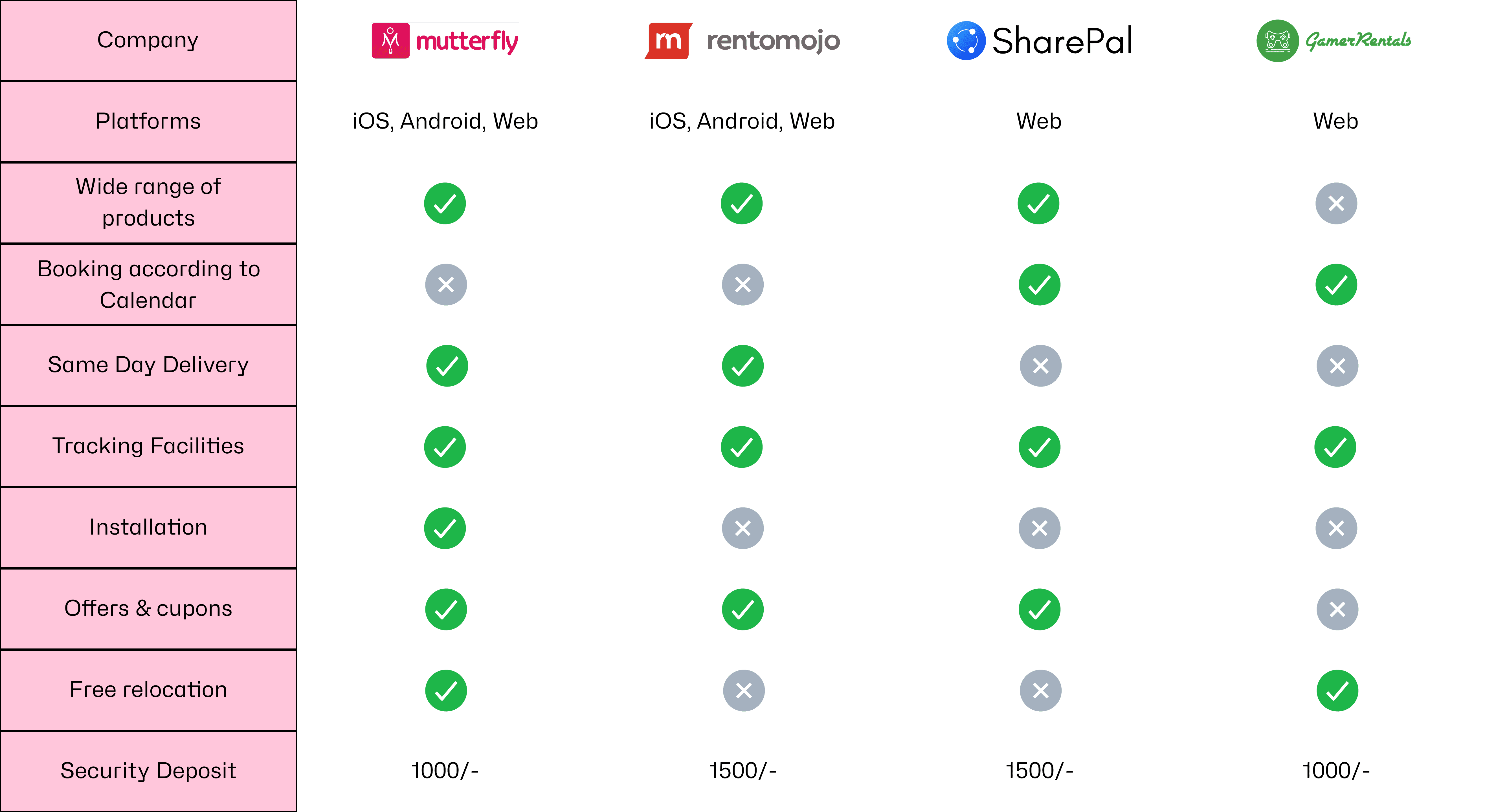 A competitive analysis assesses the strengths and weaknesses of current and potential competitors. Many renting applications are there in the market, but most need to meet users' requirements. I researched looking for similar products and compared eight websites and applications, out of which these five are competitive.